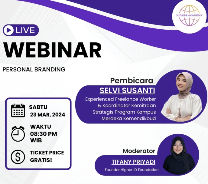 Bekasi, 23 Maret 2024 – Sebanyak 30 peserta antusias mengikuti webinar interaktif bertajuk “Personal Branding” yang diselenggarakan secara daring pada hari Sabtu, 23 Maret 2024, pukul 08:30 WIB. Webinar ini menghadirkan Selvi Susanti, seorang Experienced Freelance Worker dan Koordinator Kemitraan Strategis Program Kampus Merdeka Kemendikbud, sebagai pembicara utama. Diskusi dipandu dengan apik oleh Tifany Priyadi,