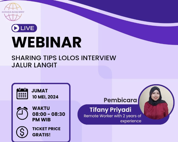 Pada Jumat, 10 Mei 2024, pukul 08:00 – 08:30 PM WIB, sebuah webinar menarik bertajuk “Sharing Tips Lolos Interview Jalur Langit” telah sukses diselenggarakan. Webinar gratis ini menghadirkan Tifany Priyadi, seorang Remote Worker berpengalaman, sebagai pembicara utama. Dalam sesi singkat namun padat ini, Tifany Priyadi membagikan metode unik “Jalur Langit” yang ia terapkan untuk sukses